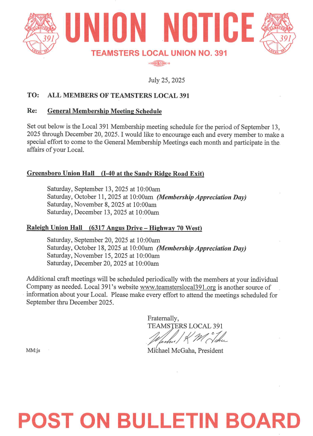 Local 391 invites members and their families to attend membership meetings this Fall. Meetings are on Saturdays at 10AM on the second Saturday in Greensboro and on the third Saturday in Raleigh of every month.