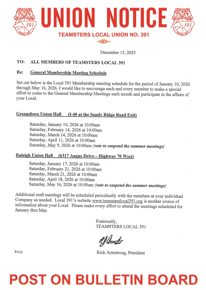The schedule for Local 391’s General Membership Meetings (January-May 2026) is now online and Local 391 President Rick Armsrong encourages all members to attend as many meetings as possible.