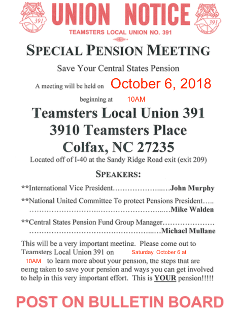 | Local 391 invites all members to attend the Save Your Central States Pension special meeting on Satuday, October 6 at 10am at the Greenboro Union Hall.  The meeting was initially scheduled for Sunday, September 16, 2018 at 1PM but Hurricane Florence caused the event to be delayed.   Special guest speakers include IBT Vice President John Murphy, National United Committee to Protect Pensions President Mike Walden, and Central States Pension Fund Group Manager Michael Mullane.   "This is an important meeting for all Local 391 members in the Central States Pension plan as we hear steps taken to ensure the pension along with understanding what we can do at the local level to help with this important effort," said Local 391 President Mike McGaha.