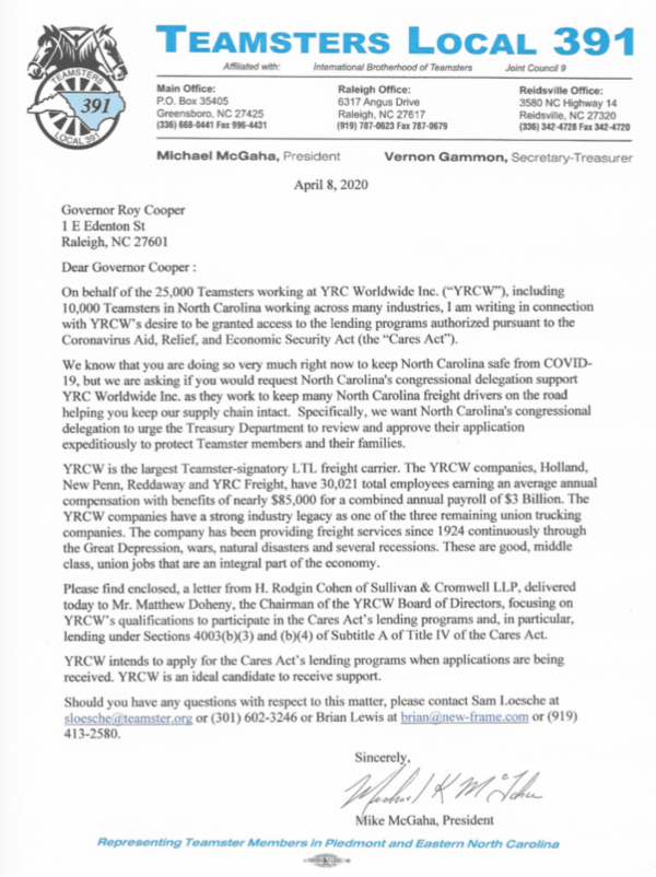 "We want to help the Treasury Department understand that YRC is an excellent candidate for CAREs Act loans and that good, middle class jobs will be protected if their applications is approved quickly, including jobs right here in North Carolina," said Local 391 President Mike McGaha.