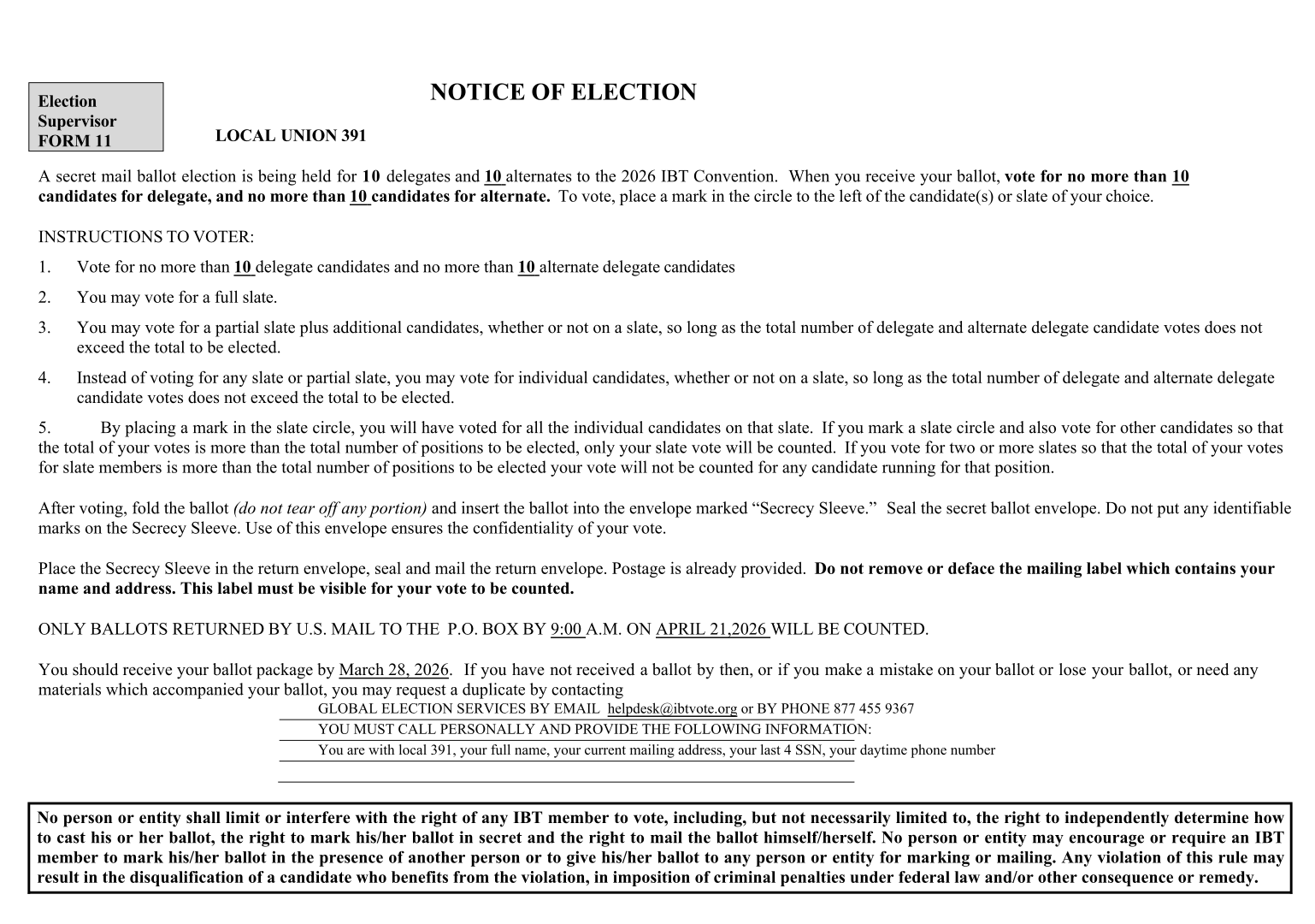 Members who do not receive their ballot by March 28, or who need a replacement due to loss or error, may request a duplicate ballot by contacting Global Election Services by email at helpdesk@ibtvote.org or by phone at 877-455-9367. Members requesting a replacement must call personally and provide identifying information, including their name, current mailing address, the last four digits of their Social Security number, and a daytime phone number.